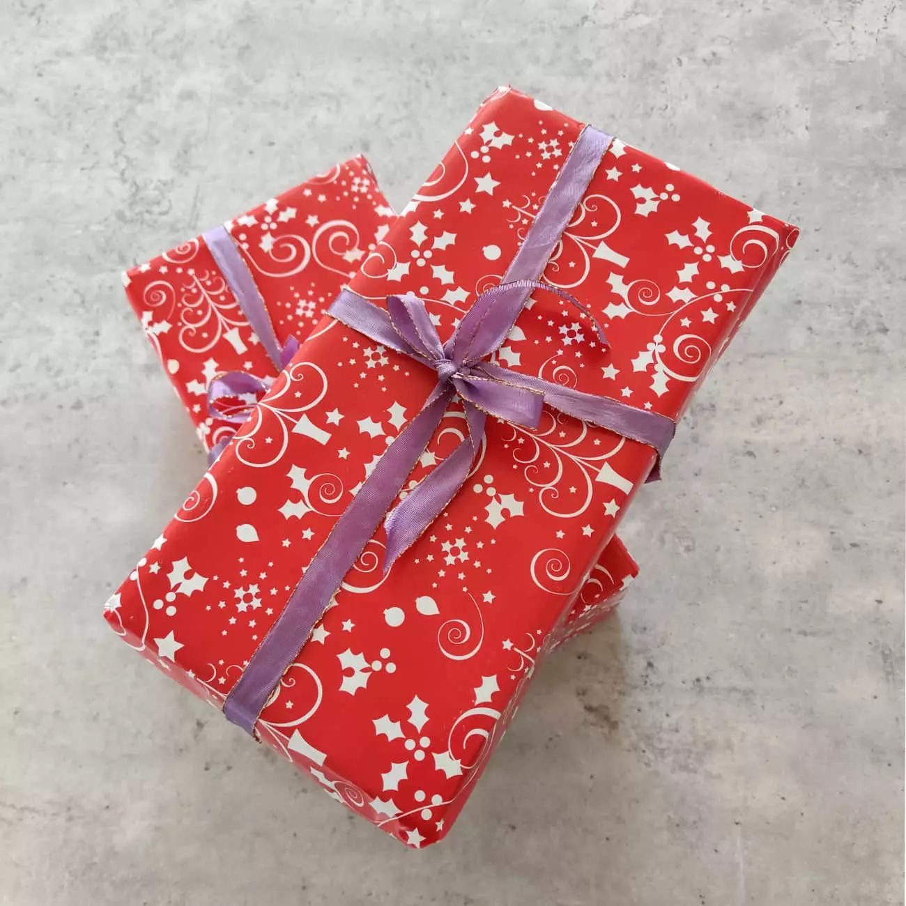 Step 3: Kom gavepapir eller gavebånd rundt om pakken og slut af med en sløjfe.