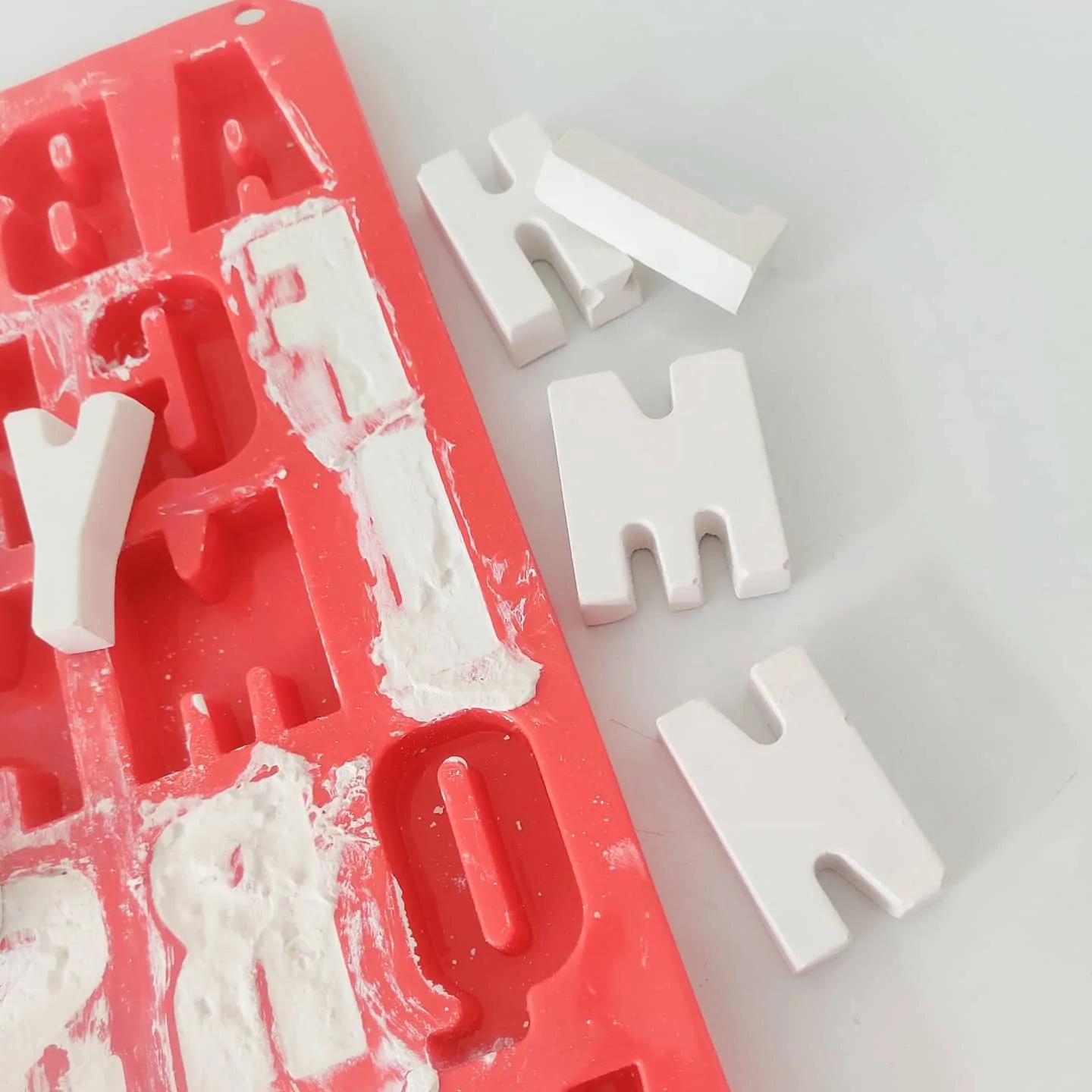 Step 2: Hæld din blanding i silikoneformen, du kan evt. lade være med at fylde dem helt op, hvis du ønsker at bogstaverne bliver smallere. Brug evt. en tandstik til at fordele det helt ud og eller ryst forsigtig silikoneformen, så blandinger kommer ud til alle siderne.