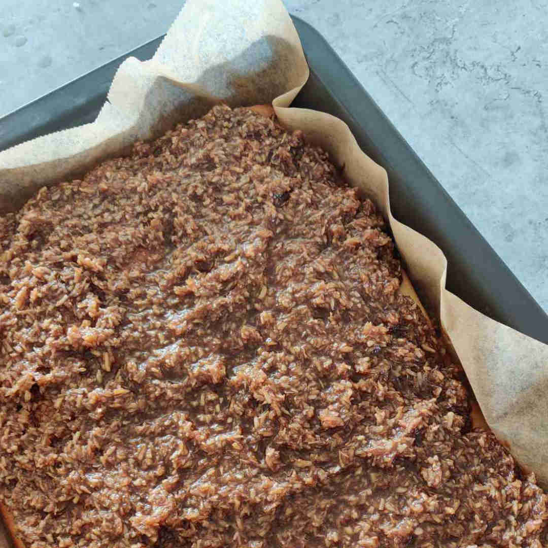 Step 3: Indstil ovnen på 200 grader. Kom bagepapir i en bradepande/kageform ca. 30 x 22 cm og kom kagen i ovnen, når ovnen er klar.