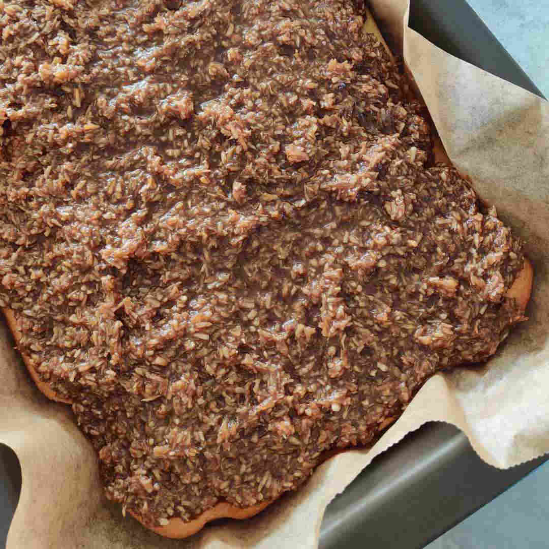 Denne klassiske kage har charmeret ganer i årtier med sin bløde, luftige konsistens, rigelige karameliserede kokostopping og en dyb, fyldig smag, der får dig til at svæve på en sky af sød tilfredsstillelse.