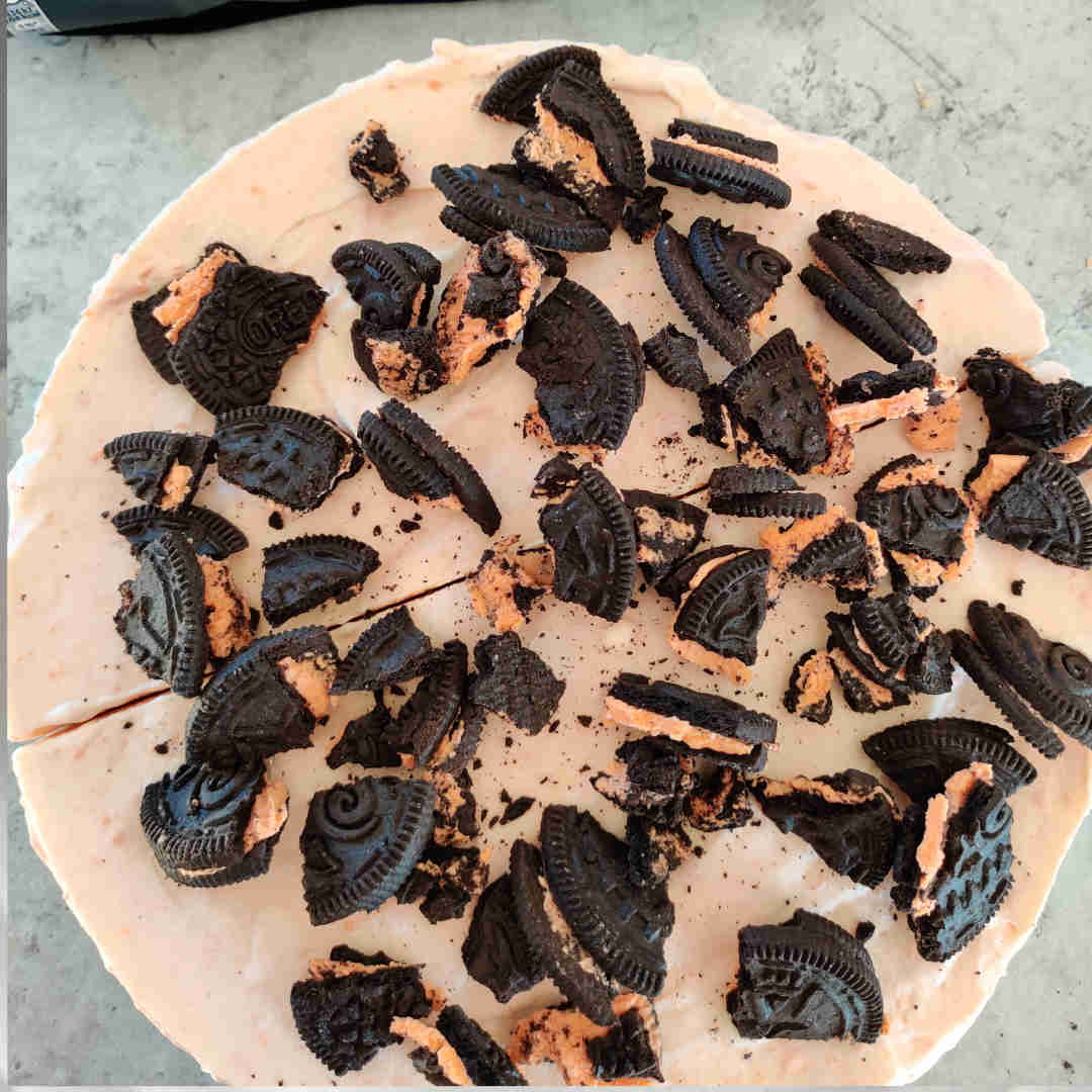 1. Knus 1 pakke oreos i ønskede stykker til topping